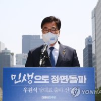 당대표 출마 선언하는 민주당 우원식 의원 (서울=연합뉴스) 더불어민주당 우원식 의원이 15일 서울 중구 청계광장에서 당 대표 출마 선언을 하고 있다. 2021.4.15 [국회사진...