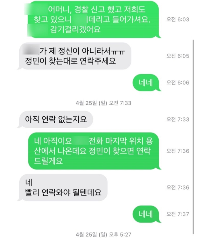 두 사람 사이에 오간 메시지에는 실종 당일 오전 6시3분쯤 정민씨 어머니가 A씨 어머니에게 보낸 “경찰에 신고했고 저희도 찾고 있으니 A씨 데리고 들어가라”는 내용, 2분 후 A씨 어머니가 “A가 제정신이 아니라서 정민이 찾는대로 연락달라”고 답해온 내용이 담겼다.